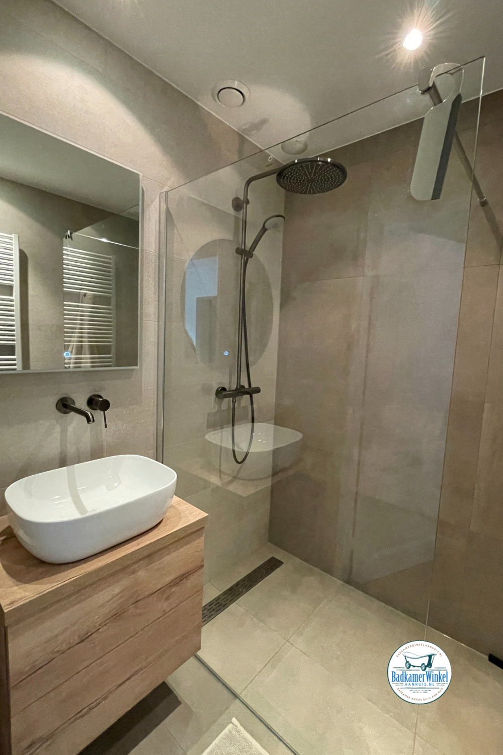De kleinere badkamer straalt een knusse en intieme sfeer uit, met een doordachte inloopdouche en een compactere variant van het badmeubel, speciaal aangepast aan de beschikbare ruimte. Hier hebben we met zorgvuldig ontwerp en hoogwaardige materialen een functionele en stijlvolle ruimte gecreëerd.