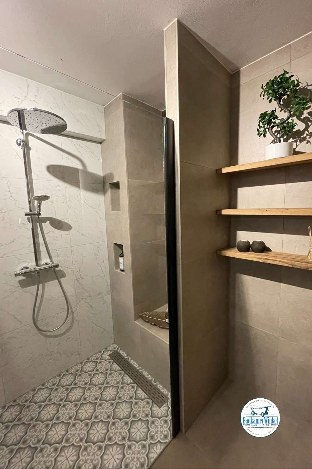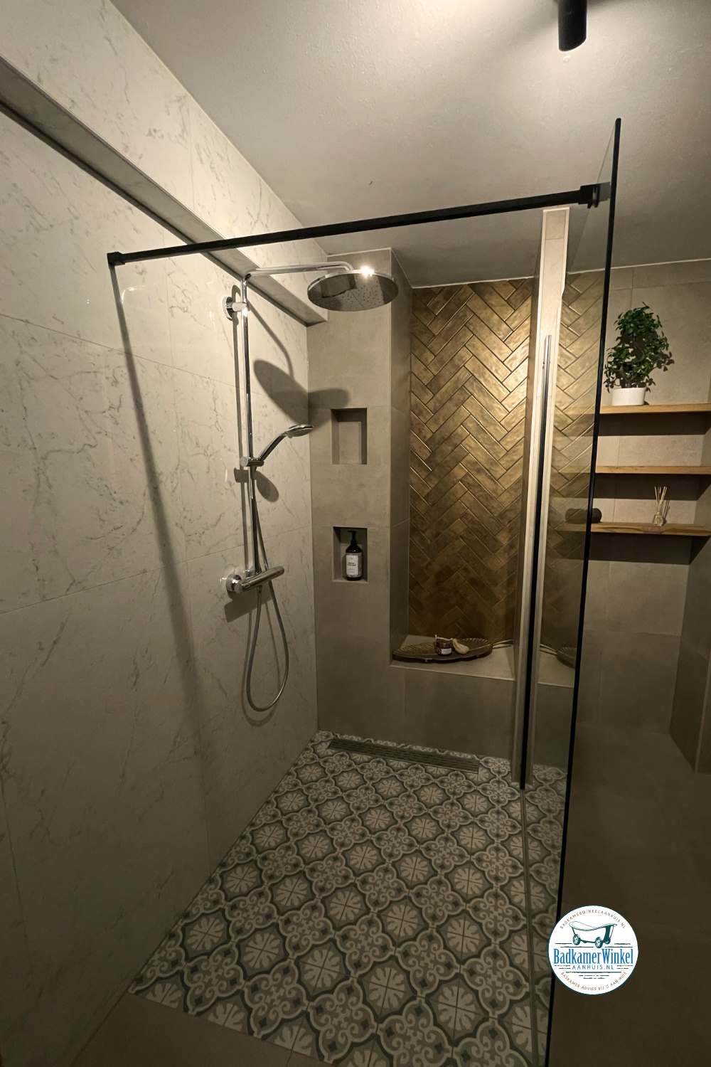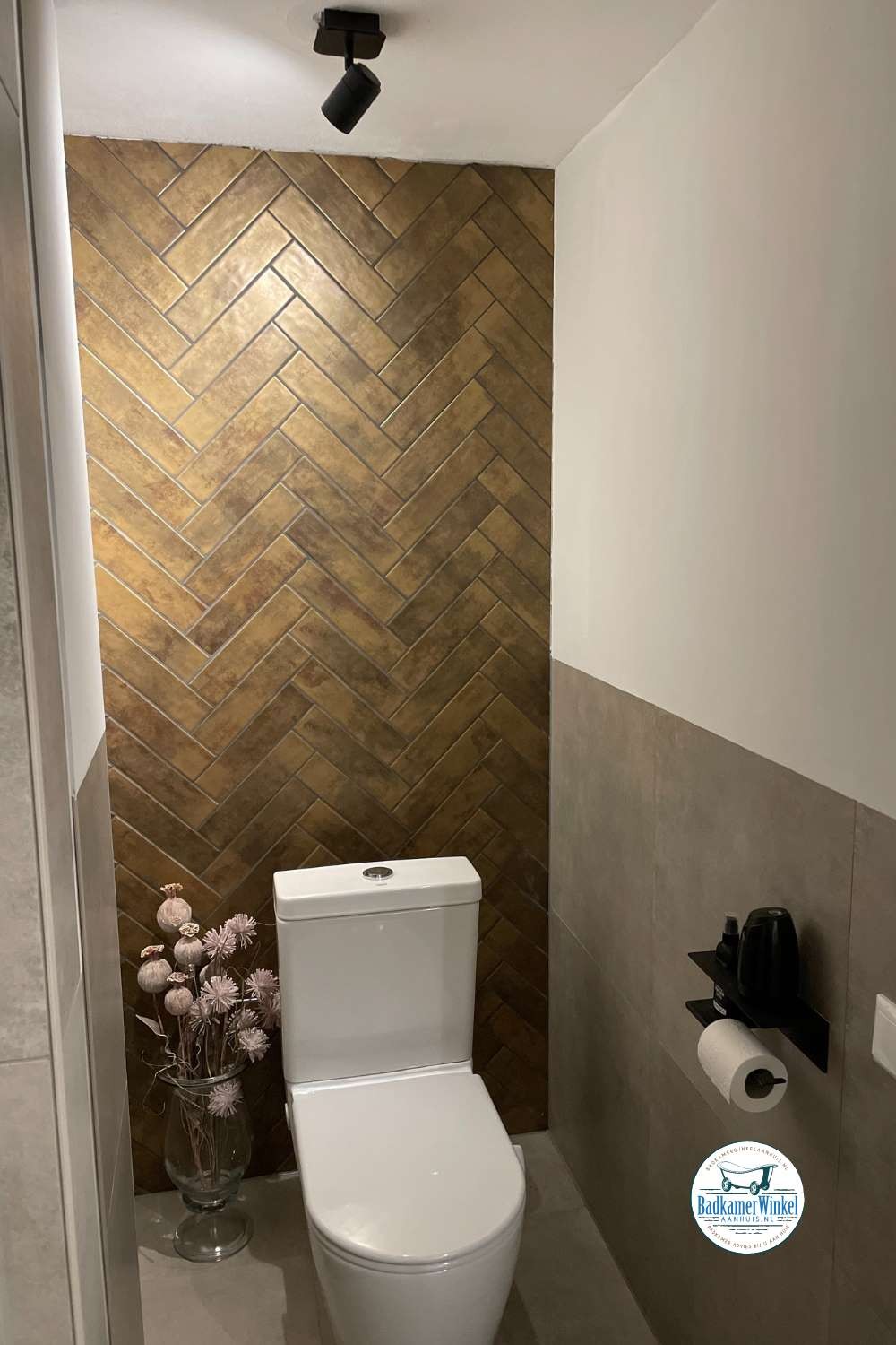 Deze klant heeft gekozen om goudtinten, marmer en betonlook taupe in haar badkamer te verwerken. Daarbij heeft ze gekozen voor een Scrapwood meubelkast, badkamermeubel en plankjes om het luxe gevoel compleet te maken.
